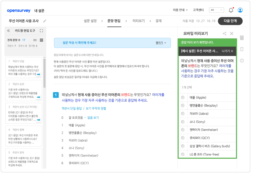 오픈서베이의 핵심 서비스인 모바일 기반 설문 플랫폼입니다.