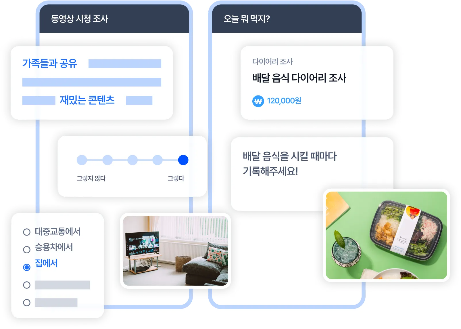 ‘내 의견의 가치’ 오베이 앱에서는 20만 명 이상의 활성 패널에게 앱 푸시 메시지로 설문 응답을 요청하고 데이터를 수집합니다. 긍정적인 패널 경험을 위해 기프티쇼 구매나 상품권, 현금으로 교환할 수 있는 앱 내 보상을 제공합니다. 블라인드 시사회, HUT (Home Use Test) 등에서도 쉽고 빠르게 데이터를 확보하며, 1천 명 대상의 설문도 평균 3시간 이내에 데이터 수집이 완료됩니다.