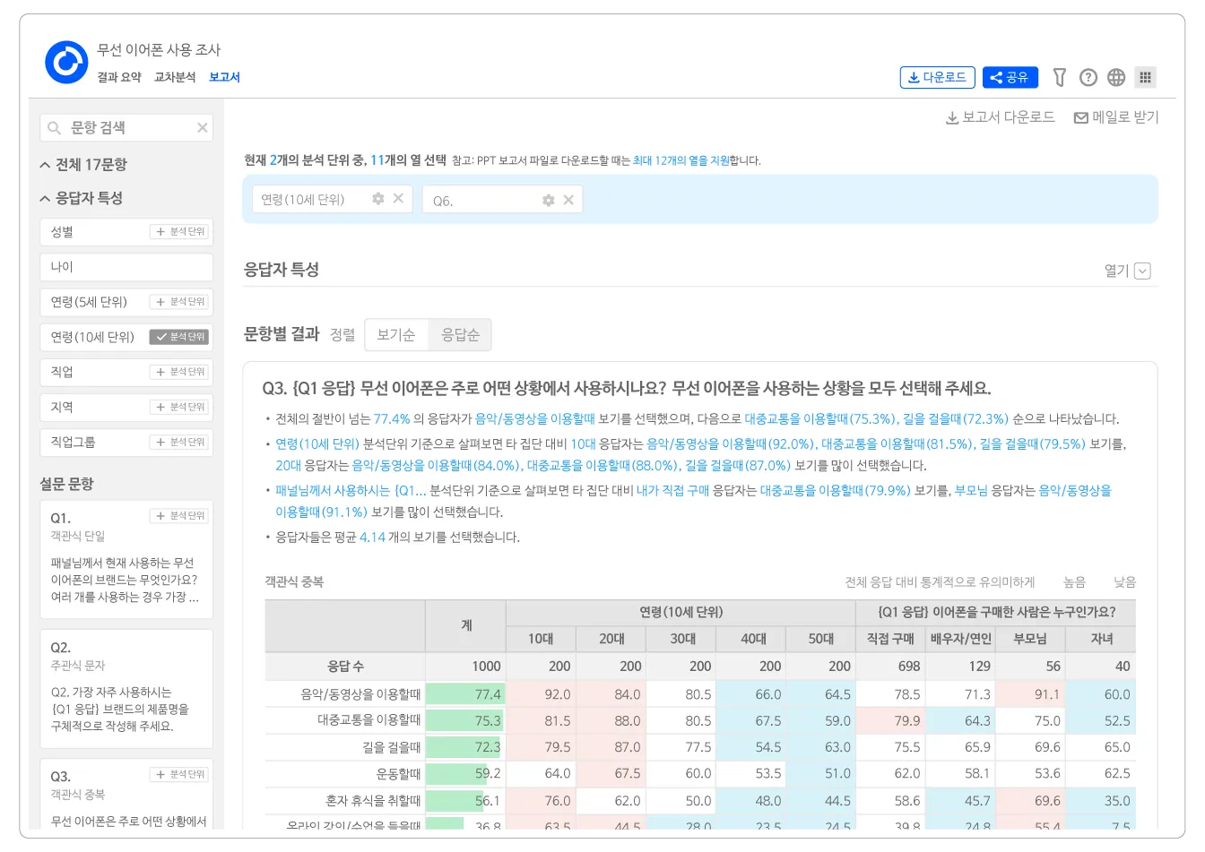 오픈애널리틱스는 이제까지 없던 새로운 분석 경험을 제공하는 설문 결과 데이터 분석 플랫폼입니다. 결과 요약, 교차 분석, 보고서 기능 등 설문 데이터를 실시간으로 분석하고, 이를 시각화해 최적화된 그래프로 보여주는 프로덕트예요.